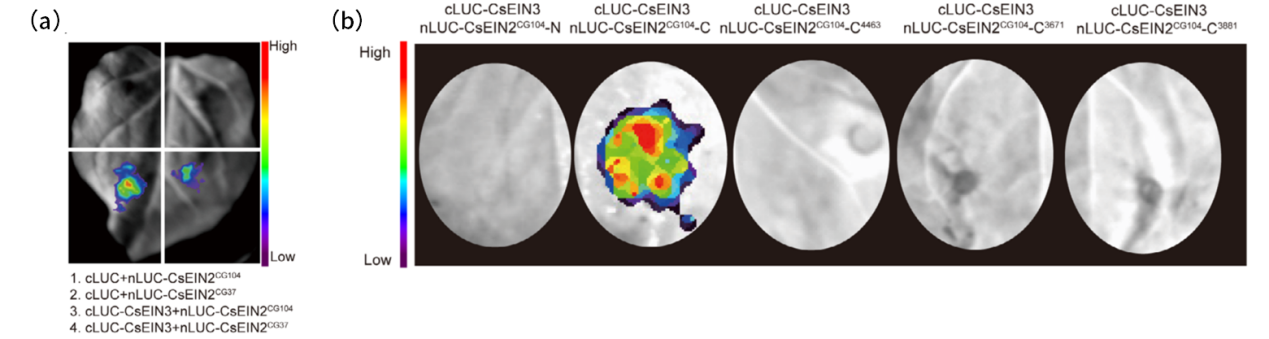 图1. (a) 本氏烟草叶片中的LCI测试显示了来自不同基因型的CsEIN2片段与全长CsEIN3之间的相互作用。(b) 本氏烟草叶片中的LCI测试显示了截短的CsEIN2——基于CsEIN2的C-末端的不同突变体与全长CsEIN3之间的相互作用。