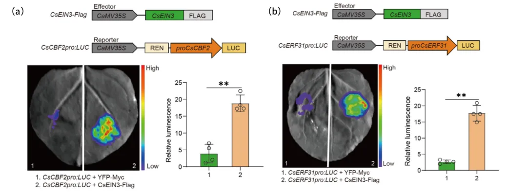 图2. (a) 双荧光素酶报告基因测定表明CsEIN3激活烟草叶片中的CsCBF2表达。(b) 双荧光素酶报告基因测定显示CsEIN3激活烟草叶片中的CsERF31表达。