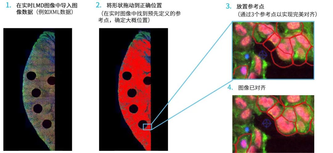 为了在MMI CellCut/CellRobot系统内进行精确对齐,最初在整个载玻片图像上确定了三个参考点。重要的是要确保选择样品的独特且可识别的特征,例如特定细胞、解剖结构或组织的几何独特区域作为参考点。将形状导入LMD系统后,必须在实时图像上识别相同的三个参考点。此对齐过程将整个载玻片图像的坐标叠加到LMD系统的坐标上,从而实现形状的准确定位和无缝集成。