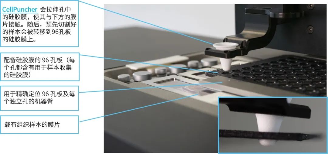MMI自动化激光显微切割系统CellRobot采用特殊设计的96孔板,每孔均配备弹性硅胶膜。将装载在膜载玻片上的组织样本置于该板下方,当MMI激光精准切割目标细胞时,CellPuncher(图中白色孔状物体)自动化下压轻柔拉伸硅胶膜,将切割后的细胞直接收集至对应孔中。
