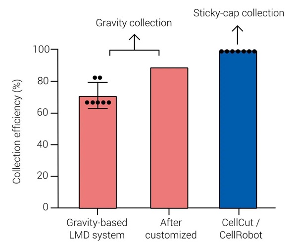 借助自动LMD系统的CellRobot机械臂与创新的粘性帽技术,可以实现高精准和高效的样本收集 —— 独立研究已证实其收集效率达到 100%(下图)。这一效率水平显著高于基于重力的方法,后者常导致样本损失,在自动化工作流程中尤为明显。