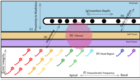 研究阐明ENI质量受四大因素调控:电流路径阻抗(受纤维化组织影响)、电极-蜗轴距离(EMD)、SGC存活状态(影响动态范围)以及频率-位置错配(FTPM)。通过