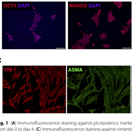 通过形态学观察和免疫荧光染色证实,iPSC成功分化为具有典型成纤维细胞特征的iFBs。分化后的细胞表达波形蛋白(vimentin)和α平滑肌肌动蛋白(ASMA),同时下调了多能性标志物OCT4和NANOG。