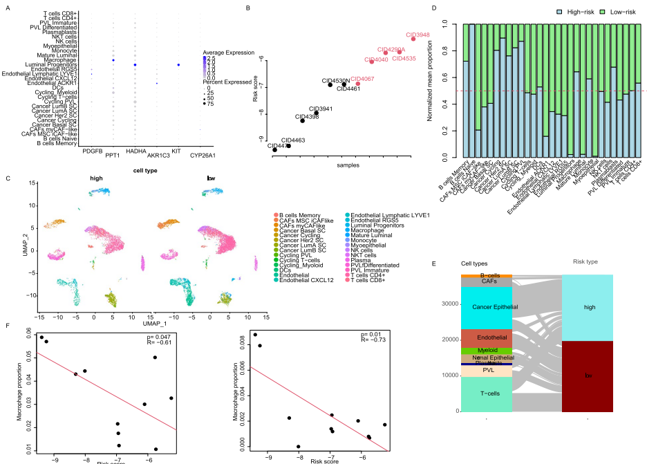 单细胞测序揭示PPT1在巨噬细胞高表达,KIT在管腔祖细胞特异表达。高风险组增殖性髓系细胞比例增加(R=-0.73, p<0.001),且细胞互作强度降低37%。特别值得注意的是,高风险组SPP1(骨桥蛋白)信号通路激活,而低风险组保留SIRPα/CD47免疫检查点通路。