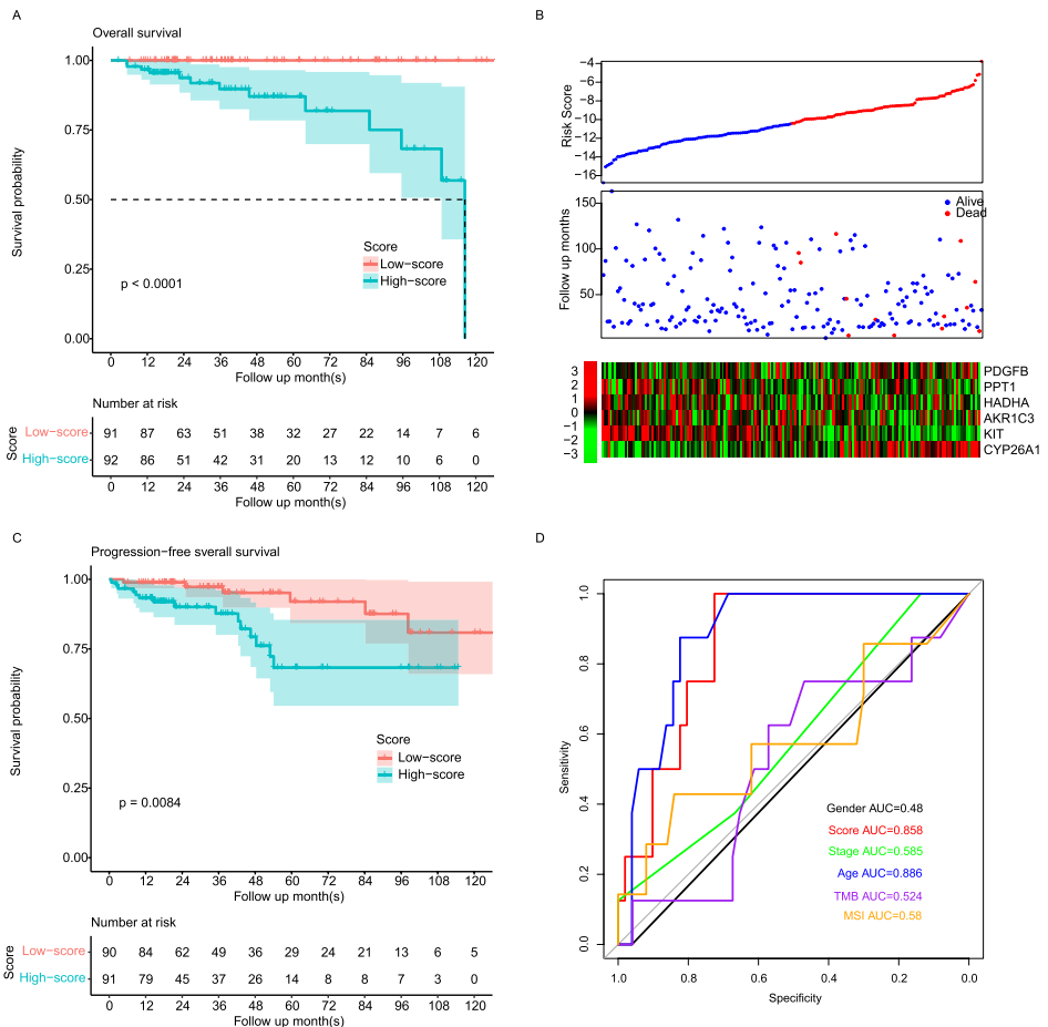 研究团队从TCGA数据库中筛选183例接受他莫昔芬治疗的ER+乳腺癌患者,通过穷举法从23个候选基因中确定最优6基因组合:PDGFB(促血管因子)、PPT1(棕榈酰蛋白硫酯酶)、HADHA(线粒体三功能酶)、AKR1C3(醛酮还原酶)、KIT(干细胞因子受体)和CYP26A1(维甲酸代谢酶)。风险评分公式显示,PDGFB和CYP26A1高表达预示不良预后,而PPT1和KIT则具有保护作用。模型将患者分为高低风险组后,5年生存率差异显著(p<0.001),且所有死亡病例均集中在高风险组。