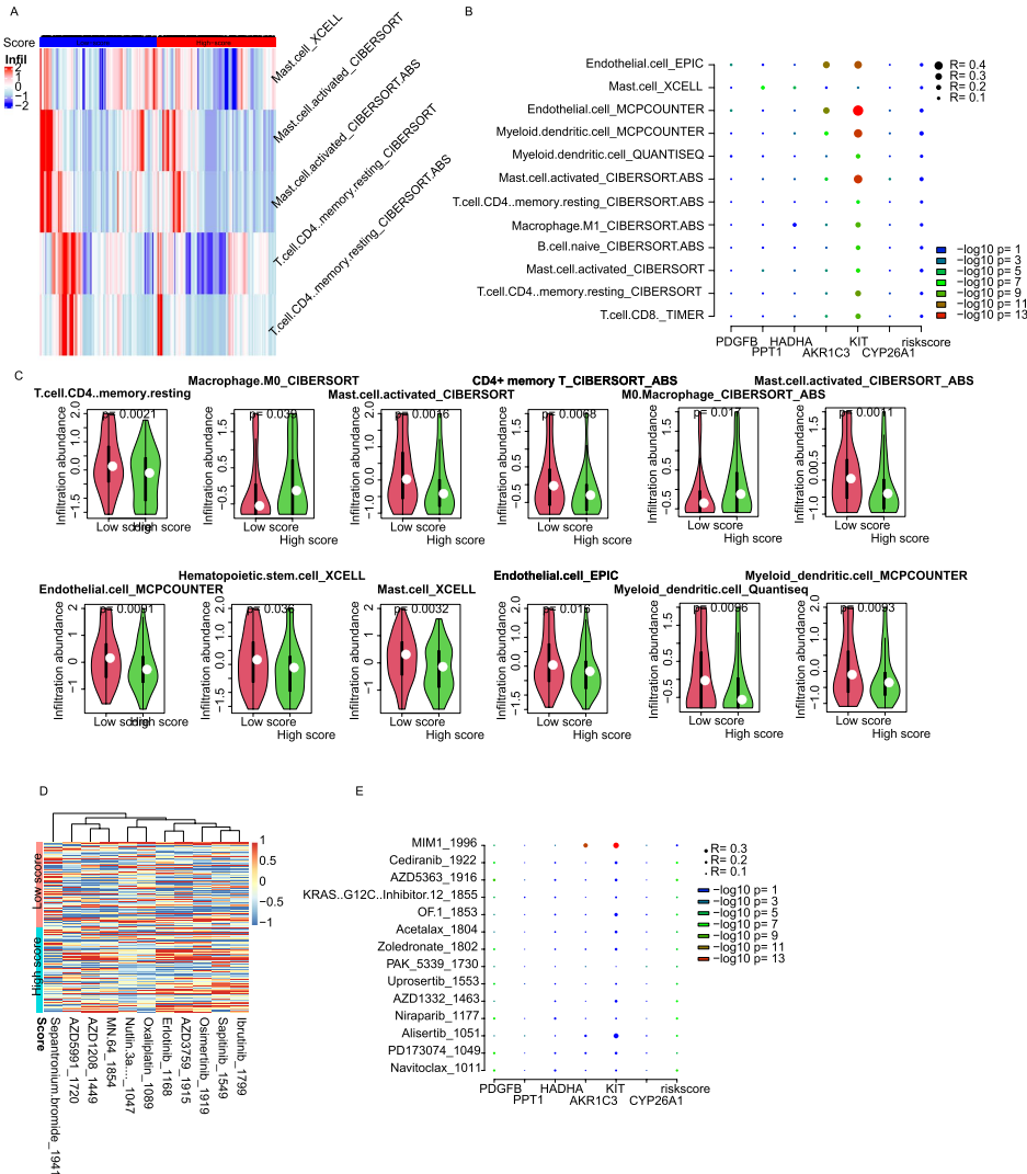 免疫浸润分析显示低风险组富含静息CD4+记忆T细胞(p=0.003)和活化树突细胞(p=0.007),而高风险组M0型巨噬细胞增加2.1倍(p=0.001)。药物敏感性预测显示低风险组对常规化疗更敏感(IC50降低37%),而高风险组对Sepantronium bromide(凋亡诱导剂)敏感性增加。