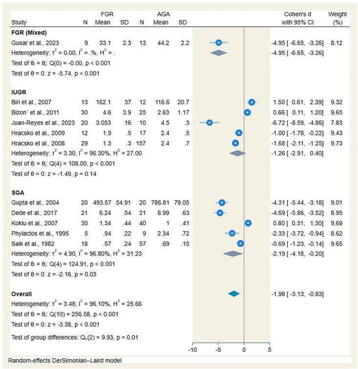 按采样部位分层显示,动脉血样本中SOD活性降低最为显著(d=-4.95),提示可能反映更直接的胎儿氧化状态。而静脉血样本变化相对缓和,可能受胎盘代谢调节影响。IUGR病例的氧化应激程度普遍重于单纯SGA,支持其病理本质的差异性。