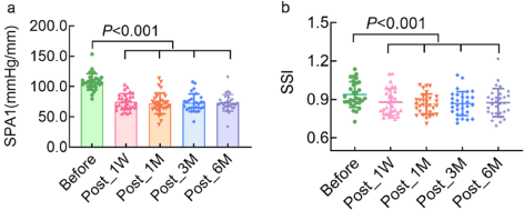 生物力学参数变化:刚度参数SPA1和应力应变指数(SSI)术后显著降低,而弹性模量(E)短期激增37%后逐渐回落,3个月趋于稳定。
