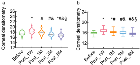 组织密度动态:0-2mm区域角膜密度值术后1周最高,6个月内持续下降,提示长期重塑过程。