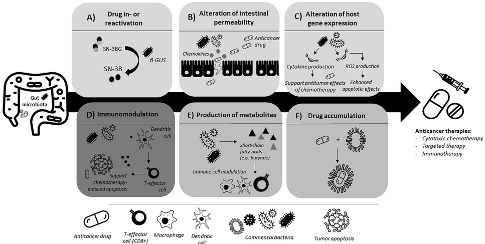 化疗作为癌症治疗的基石,却长期面临两大难题:疗效的"盲盒效应"——患者对相同方案的反应差异悬殊;毒性的"俄罗斯轮盘赌"——40%-100%患者会出现胃肠道不良反应。更令人沮丧的是,传统指标难以预测这些个体差异。近年来,肠道中数万亿微生物组成的"隐形器官"逐渐进入科学家视野,它们通过代谢药物、调节免疫等途径(如图2所示)
