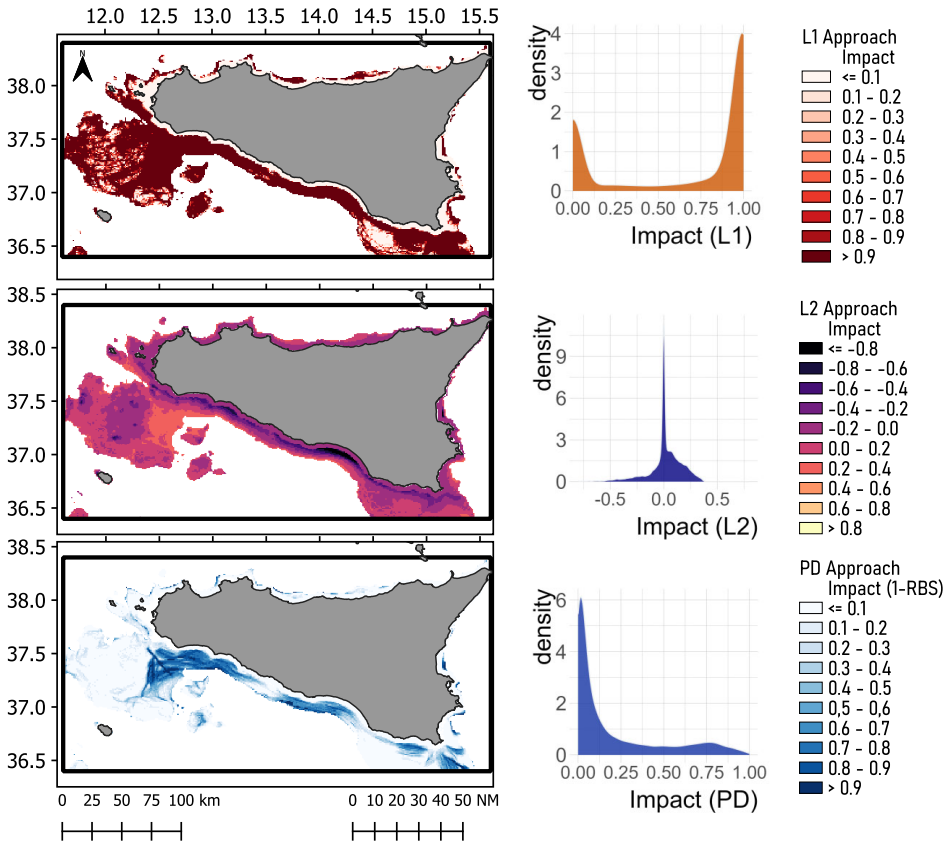 意大利巴勒莫大学(University of Palermo)联合英国班戈大学(Bangor University)等机构的研究团队,在《ICES Journal of Marine Science》发表了一项突破性研究。他们创新性地将底栖生物的寿命特征转化为生态"条形码",建立了包含三个关键指标(L1、L2、PD)的定量评估框架。通过分析2010-2020年间173个拖网调查站点的非目标底栖动物数据,结合船舶监测系统(VMS)的捕捞强度数据,首次绘制出西西里大陆架底栖群落的状态图谱。