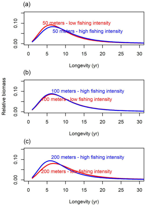 模型显示海底群落呈现深度分异现象:在>100米的外大陆架,拖网强度增加使群落向短寿命物种转变;而在<100米的浅海区却出现反常的寿命延长趋势。这归因于软珊瑚(Alcyonium palmatum)和海笔(Pennatula spp.)等中长寿物种的顽强存在,它们通过幼虫扩散和快速定居在拖网干扰中幸存。