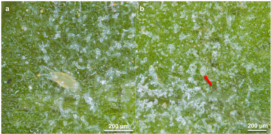 成螨繁殖能力:番茄叶盘上白粉病菌组的日均产卵量显著高于清洁叶盘(p<0.001),但低于花粉组。产卵位置呈现特异性——偏好将卵产于菌丝体中央(如图1b所示),而非毛状体尖端。