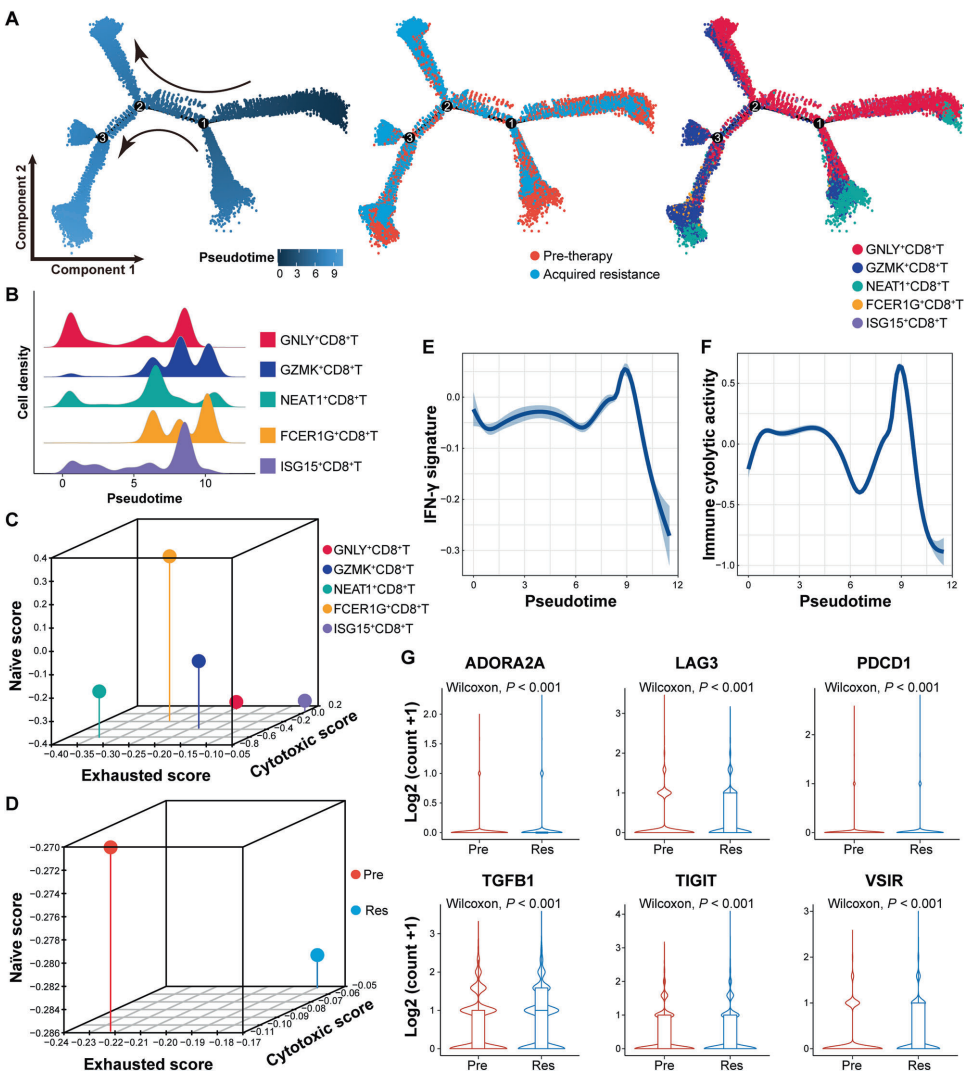分析显示耐药样本中细胞毒性CD8+T细胞(GNLY+、GZMK+)比例显著增加(P<0.001),伴随耗竭标志物TIGIT/LAG3上调。伪时序分析揭示这些细胞处于终末分化状态,持续分泌IFN-γ但伴随功能衰竭。
