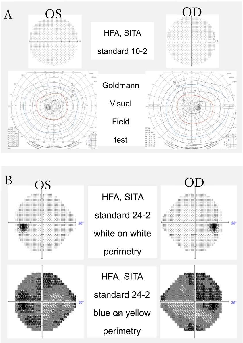 研究采用的关键技术包括:1)标准化的视力功能评估(BCVA、CFF、对比敏感度和色觉检查);2)多模式视野分析(HFA SITA标准10-2/24-2白-白视野和蓝-黄视野);3)高分辨率OCT视网膜分层成像;4)全视野和局部黄斑视网膜电图(ERG)记录;5)基于全外显子测序的基因检测及生物信息学分析(SpliceAI预测)。