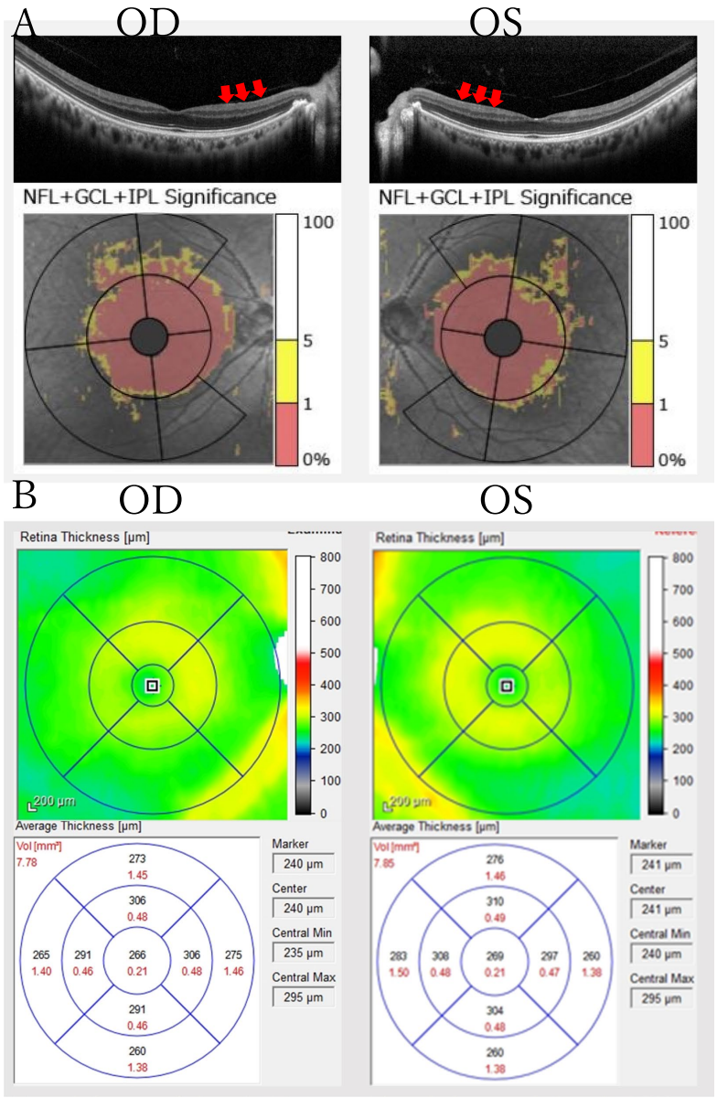 本研究报道了一例56岁男性患者,其携带OPA1基因新型杂合剪接位点突变(c.2331+2T>G),却长期保持相对良好的视觉功能(BCVA 0.6-1.0)。通过光学相干断层扫描(OCT)发现特征性视盘周围神经纤维层变薄,结合蓝黄视野检查发现亚临床功能障碍,最终经全外显子测序确诊为常染色体显性视神经萎缩(ADOA)。该研究揭示了ADOA临床表现的高度异质性,强调了基因检测在不明原因视神经萎缩诊断中的关键作用。