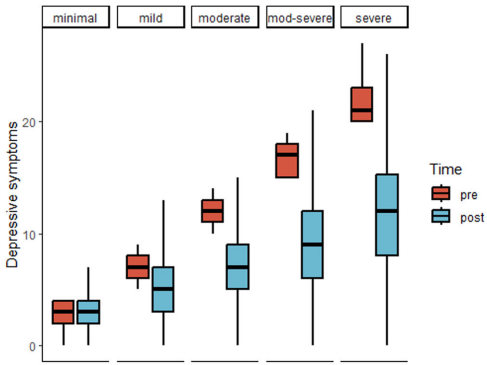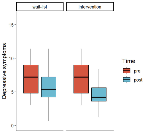 干预组抑郁症状改善幅度(ΔM=-3.92, d=-0.75)显著大于对照组(ΔM=-1.94, d=-0.37),幸福感提升也仅见于干预组(ΔM=0.45, d=0.60)。
