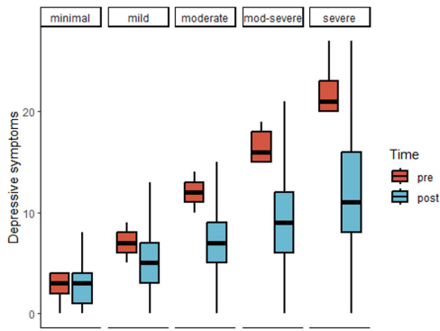 59.8%的完成率远超同类研究(通常<15%)。抑郁症状平均降低34.37%(ΔM=-3.67, d=-0.82),幸福感提升14.87%(ΔM=0.50, d=0.64)。分层分析显示,重度症状用户改善最显著(ΔM=-9.40, d=-2.63)。