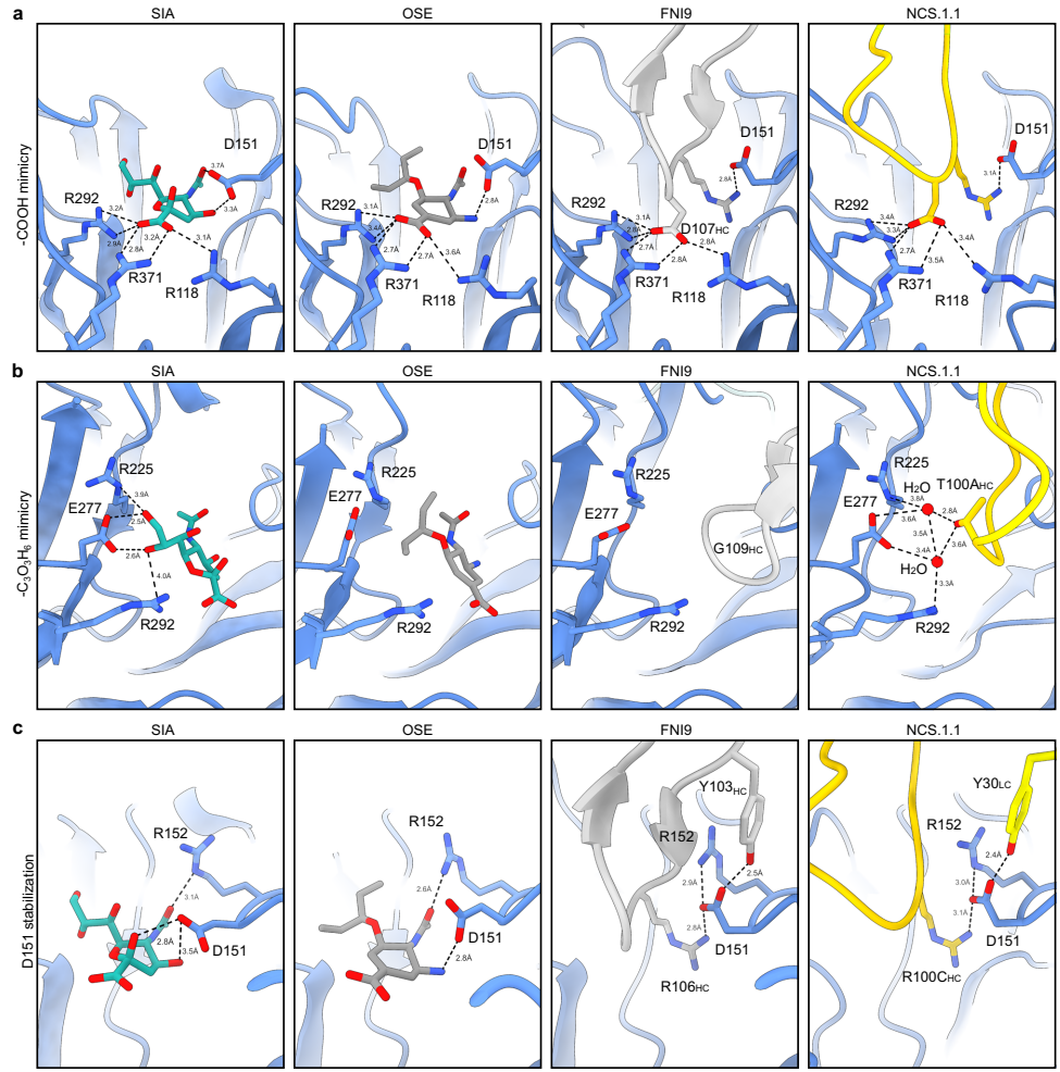 冷冻电镜结构显示NCS.1.1通过CDRH3的Asp-Arg(D100BHC-R100CHC)基序插入NA催化口袋,与R118NA、R293NA形成离子网络。更惊人的是,两个水分子精确模拟了唾液酸C8/C9羟基的空间位置,这种"水介导的锁钥结合"机制在3.36?的N5-DB16复合物结构中得到验证。