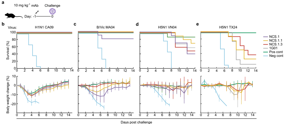 在病毒抑制试验中,NCS.1.x对H5N1 clade 2.3.4.4b(CH23/TX24株)的半数抑制浓度(IC50)达μg/ml级,与经典抗体1G01相当。动物实验显示,10 mg/kg剂量下NCS.1.1对H1N1攻击提供完全保护,对近期爆发的奶牛源H5N1(德州株)也能延迟发病时间4天。