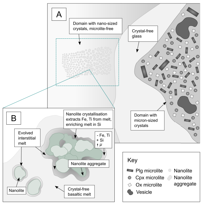 研究提出了纳米晶体在喷发过程中的动态演化模型:快速上升的岩浆经历强烈过冷(ΔT),在几分钟内结晶出20-30纳米的钛磁铁矿;这些纳米晶体通过范德华力聚集,同时从熔体中提取Fe、Ti形成高粘度边界层;这种"纳米石化"(nanotilization)过程在看似晶体贫乏的区域实际上显著改变了岩浆流变特性。这解释了Las Sierras-Masaya系统玄武质岩浆能产生普林尼式喷发的机制,也为理解其他基性火山剧烈活动提供了新视角。