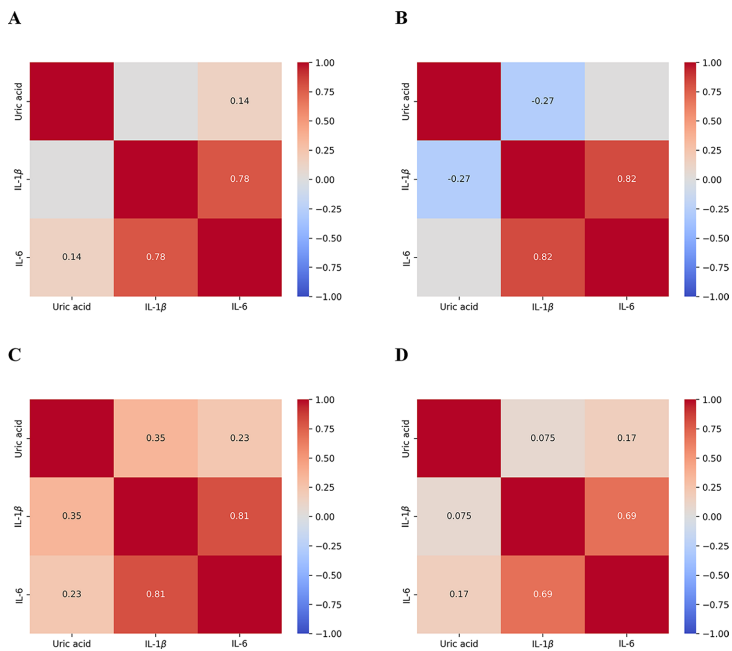 未治疗组:尿酸与IL-6(ρ=0.23)、IL-1β(ρ=0.35)显著正相关