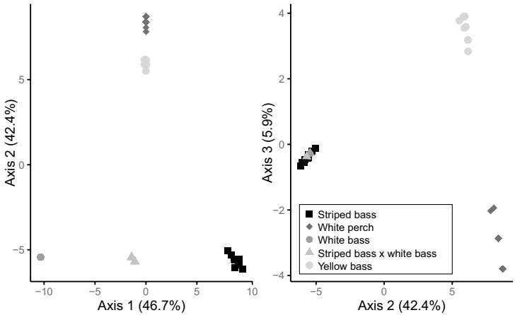 为解决北美狼鲈属(Morone)物种及其杂交种在管理保护中的鉴定难题,研究人员开发了一种基于47个SNP位点的GT-seq分型技术。该研究通过RAD-seq筛选物种特异性标记,结合PCA分析实现100%准确区分条纹鲈(M. saxatilis)、白鲈(M. chrysops)、黄鲈(M. mississippiensis)和白鲈杂交种,为种群评估提供高效低成本解决方案。