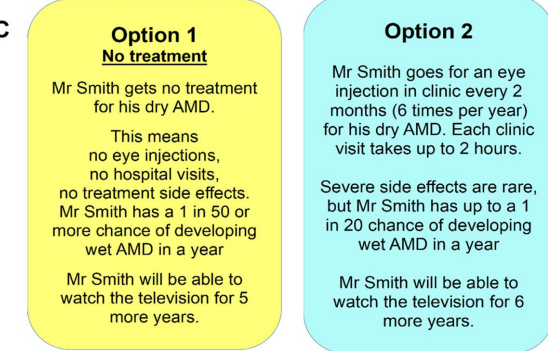 患者顾问的反馈促使研究团队做出关键改进:将抽象的"延缓视力丧失29%"表述转化为具体生活场景(如"延长看电视时间18个月");将专业术语"玻璃体内注射"简化为"眼内注射";DCE任务从直接询问参与者改为虚构案例"Smith先生"以提高代入感。如图2所示,顾问们否决了并列表格式方案,最终采用文本块布局呈现治疗场景。