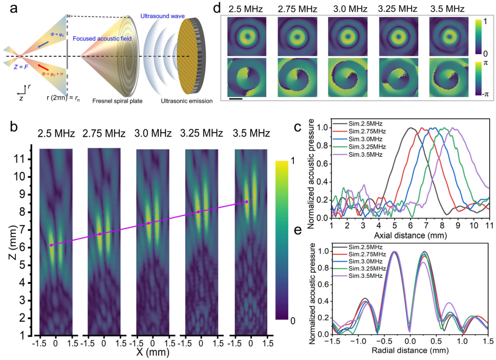 通过COMSOL仿真验证菲涅尔螺旋栅在2.5-3.5MHz的频率调焦特性,相位涡旋分析显示声压最小值位于焦点中心。