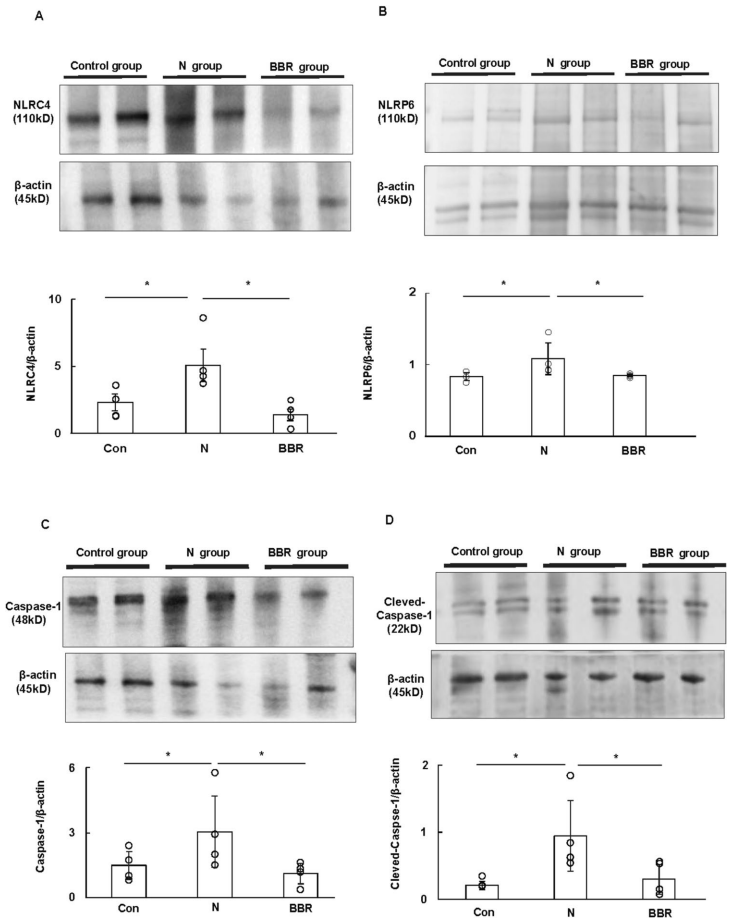 Western blot分析显示,BBR使回肠组织NLRP6和NLRC4蛋白表达分别降低54%和61%,同时抑制Caspase-1剪切活化(减少68%)。这种抑制作用具有高度选择性——经典炎症小体NLRP3的表达未受影响。相应的,BBR处理组血清IL-1β和TNF-α水平显著下降,证实其通过调控非经典炎症小体通路抑制过度炎症反应。
