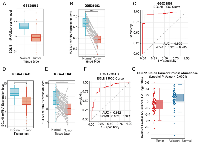 研究发现EGLN1在CRC组织中的mRNA和蛋白水平均显著低于正常组织(p<0.0001),ROC曲线下面积达0.955,展现出优异的诊断效能。这种表达差异在配对样本分析中同样显著,提示EGLN1可能具有组织特异性抑癌功能。