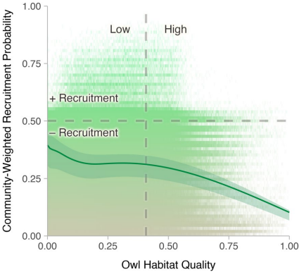 更新困境:栖息地质量与树木更新概率呈负相关(r=-0.21),86%研究区域更新概率<0.5,其中6.8%位于高质量栖息地(图2)。