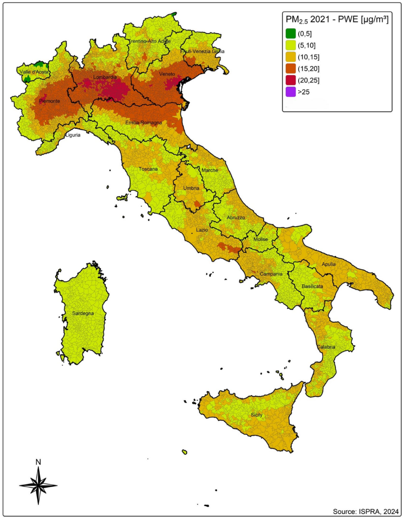 污染地理分布:通过图1和图2可见,波河谷地PM10暴露最高(2021年平均20.3μg/m3),那不勒斯内陆和萨科河谷次之。