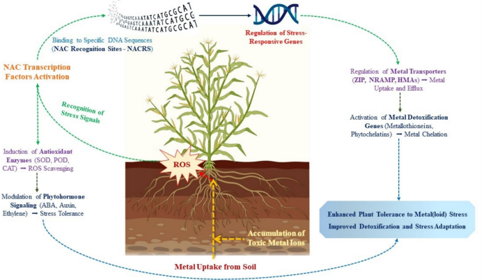 环境中的重金属(如Cd、Pb)和类金属(如As、B)污染已成为威胁全球农业生产的严峻问题。这些污染物通过工业排放、化肥施用等途径进入土壤,破坏植物细胞结构,抑制光合作用,并诱发活性氧(ROS)爆发。面对胁迫,植物进化出由转录因子(TF)主导的复杂防御网络,其中NAC家族因其兼具发育调控和应激响应的双重功能而备受关注。
