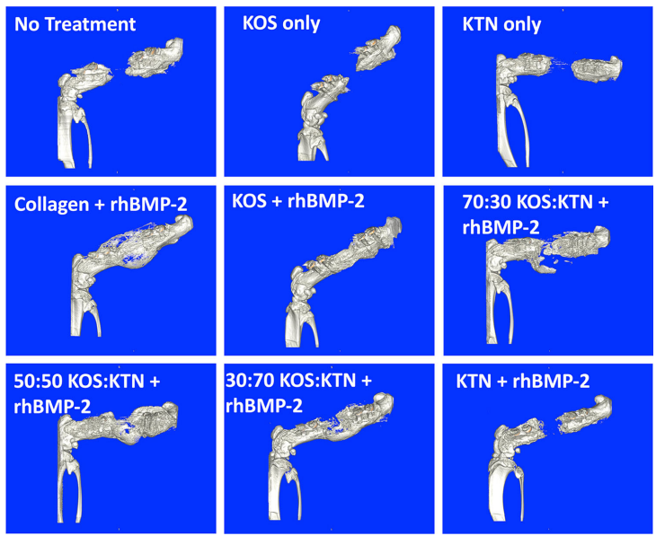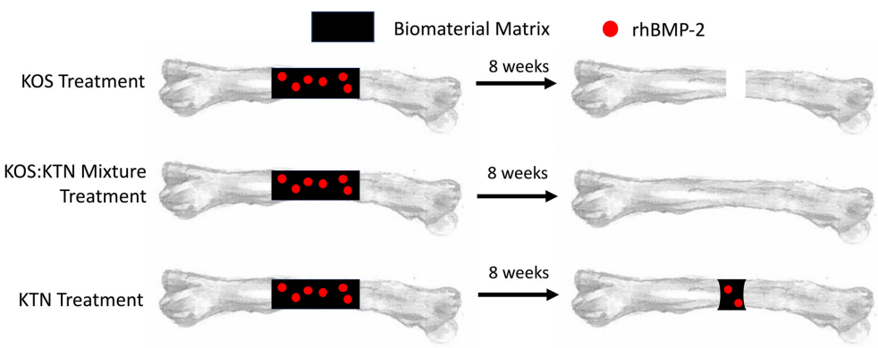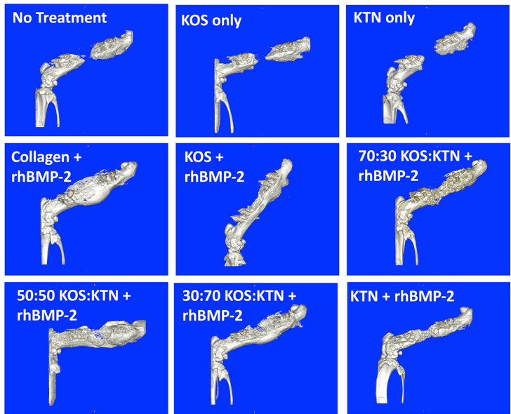桥接率:50:50 KOS:KTN+rhBMP-2组8周时实现100%桥接(6/6),与胶原组相当,而纯KOS或KTN组仅部分桥接(图1-3)。
