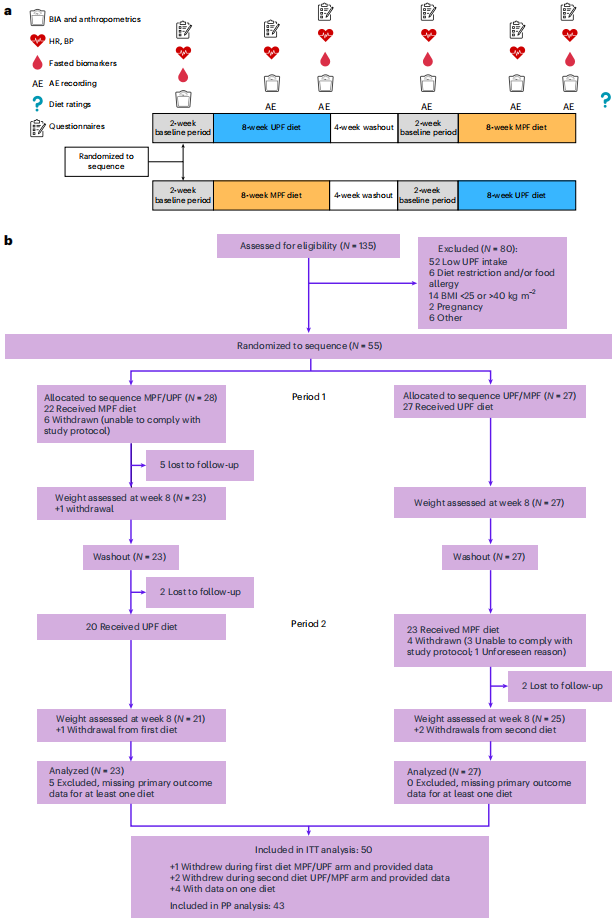 研究人员采用创新的社区型2×2交叉设计,为55名习惯性UPF摄入量≥50%的超重/肥胖成人(BMI 25-40 kg/m2)提供两套严格匹配英国Eatwell指南的8周饮食方案。通过家庭配送实现自由采食(ad libitum)条件,两组饮食在宏观营养素、食物组构成甚至感官体验上高度相似,唯一变量是Nova分类定义的加工度。研究运用生物电阻抗分析(BIA)、标准化食欲视觉模拟评分(VAS)和血液生化检测等综合评估手段,在控制运动量(通过加速度计监测MVPA)的前提下,揭示了加工度对健康的独立影响。