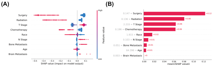 开发的在线计算器(https://lalalaanjila.shinyapps.io/Random_Forest_app/)整合TNM分期、治疗史等参数,支持个性化风险评估。SHAP分析显示手术缺失(红色特征)对风险贡献最大