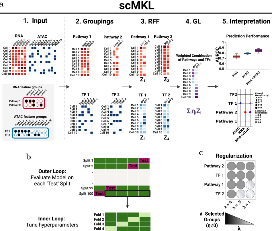 为破解这一难题,来自俄勒冈健康与科学大学(Oregon Health & Science University)的Cigdem Ak团队在《Communications Biology》发表了开创性研究。他们开发的scMKL算法巧妙融合多核学习(MKL)、随机傅里叶特征(RFF)和群组Lasso(GL),首次实现了单细胞多组学数据的可解释整合分析。这项研究不仅技术路线新颖,更在乳腺癌、前列腺癌等四种癌症类型中验证了其发现关键生物学通路的能力,为癌症机制研究和精准治疗提供了全新工具。