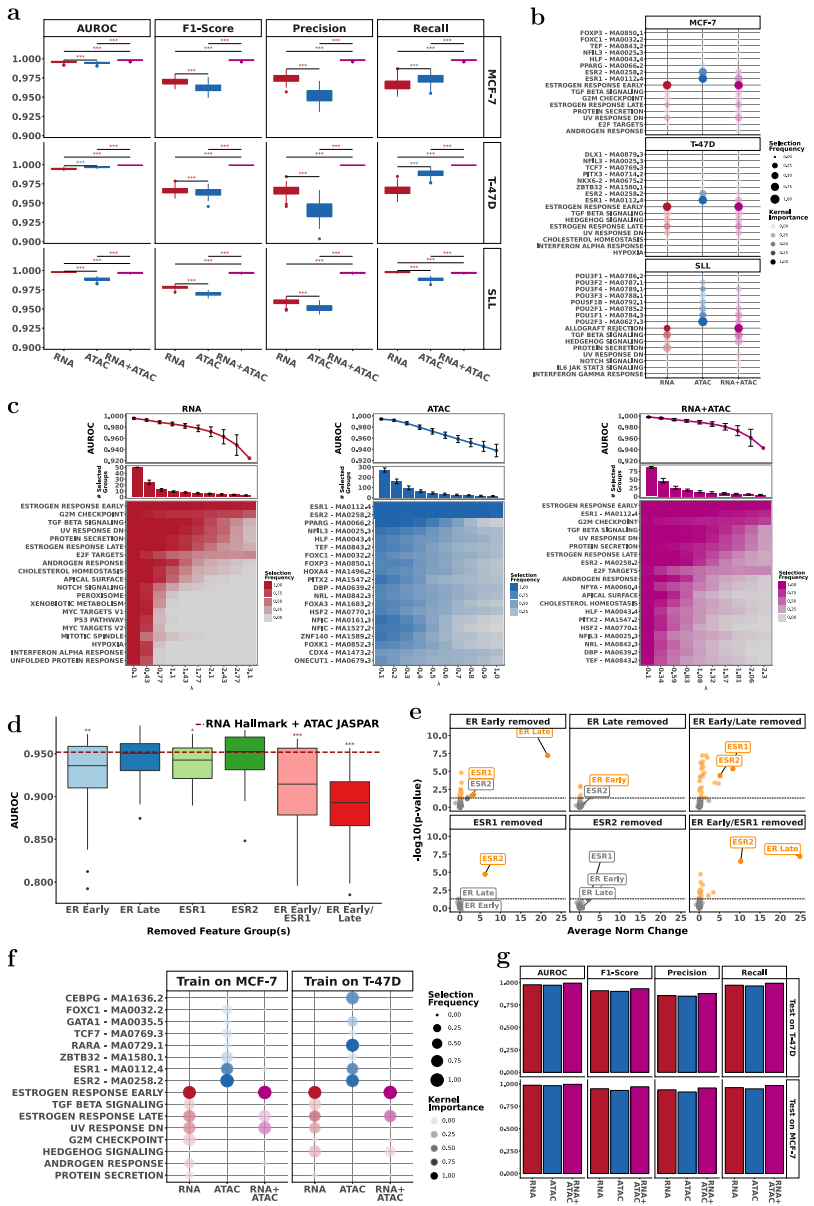 多组学整合部分揭示了跨模态协同效应。在MCF-7细胞中,RNA的ER Early通路与ATAC的ESR1结合位点被共同选择,AUROC达0.99。当人为剔除这些特征时,模型会自适应增强ESR2/ER Late等替代通路,印证了生物学合理性。转移学习实验证实,从MCF-7到T-47D细胞系的跨数据集预测保持0.96以上AUROC,且关键通路选择一致。