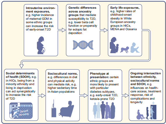流行病学数据显示,南亚、东亚、非洲、中东和西班牙裔人群的2型糖尿病患病率显著高于欧洲白种人群,且发病年龄更早。这种差异不能仅用传统危险因素解释: