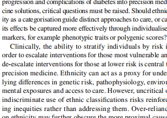 这篇综述深入探讨了(precision medicine)精准医学在糖尿病诊疗中面临的种族多样性挑战。作者Shivani Misra系统分析了(T2D)2型糖尿病和(T1D)1型糖尿病在不同种族群体中的流行病学特征、病理生理差异和治疗盲区,提出三种整合种族因素的精准医学模型:基于遗传祖先的发现(ancestry-anchored discovery)、跨种族适应性转化(ethnicity-adapted translation)和基于特征的个体化(trait-based individualisation)。文章特别强调当前研究数据中非欧裔人群的代表性不足,导致(GWAS)全基因组关联研究等工具在(LMIC)中低收入国家的适用性受限,呼吁建立更具包容性的精准医学框架。