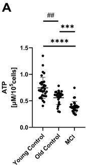MCI组的内源性呼吸显著低于YC和OC组(p<0.0001),但各复合体最大活性仅显示年龄相关下降(YC>OC≈MCI)。这种"基线呼吸受损而储备能力保留"的模式,提示PBMC可能存在代谢重编程。
