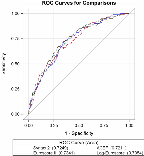 判别分析表明SYNTAX Score II(c-statistic 0.73)与其他评分无统计学差异,
