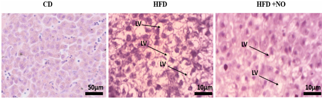 HFD组血清TG(↑68%)和TC(↑55%)显著升高,肝组织出现脂滴浸润;NO干预使血清TG、TC分别降低31%和28%,组织学显示肝细胞空泡化减少。