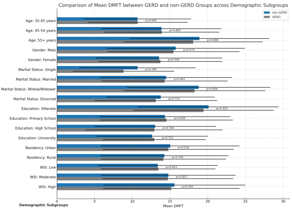 年龄分层显示55岁以上人群DMFT最高(18.2±9.1),但GERD组反而略低;男性DMFT显著高于女性(16.4 vs 13.1);吸烟者和饮酒者DMFT分别高达17.46±9.38和20.46±9.36。值得注意的是,每日刷牙≥3次者DMFT最低(11.54±6.61),而从不刷牙者高达24.03±8.42。