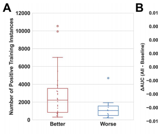 "All"模型(整合全部结构特征)在测试集显著优于基线模型(AUC0.1 0.8064 vs 0.7994,P<0.001)。特征重要性分析揭示RSA、β-折叠和卷曲概率对预测得分影响最大(Δscore下降显著,P<0.0001),而α-螺旋和无序性贡献较弱。值得注意的是,这种增益与训练数据量密切相关(图4),暗示模型需要足够样本才能捕捉结构特征的微妙影响。