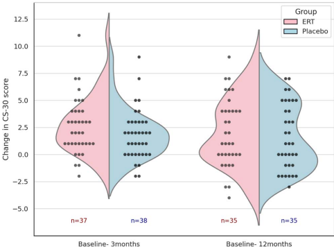 体能表现:ITT分析显示ERT组CS-30评分改善2.59次(提升17.5%),较安慰剂组(1.79次)多0.81次,但差异未达统计学意义(P=0.16)。符合方案集(PP)分析则显示ERT组显著优于安慰剂组(2.71 vs 1.53次,P=0.04)。