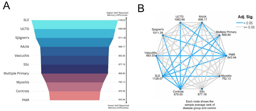 来自伦敦国王学院精神病学、心理学与神经科学研究所(Institute of Psychiatry, Psychology and Neuroscience, King's College London)的Avni Varshney等研究者开展了开创性的INSPIRE研究项目。这项发表在《Rheumatology》上的混合方法研究,通过结合大规模问卷调查(1853例SARDs患者和463例对照)与67例深度访谈,首次系统描绘了认知功能障碍在SARDs疾病谱中的分布特征及其生活影响。研究发现最令人意外的是,记忆损伤并非如预期随年龄或病程加重,而是在SLE、未分化结缔组织病(UCTD)和干燥综合征患者中尤为突出,且与患者的工作能力、社会参与和心理健康呈现显著负相关。