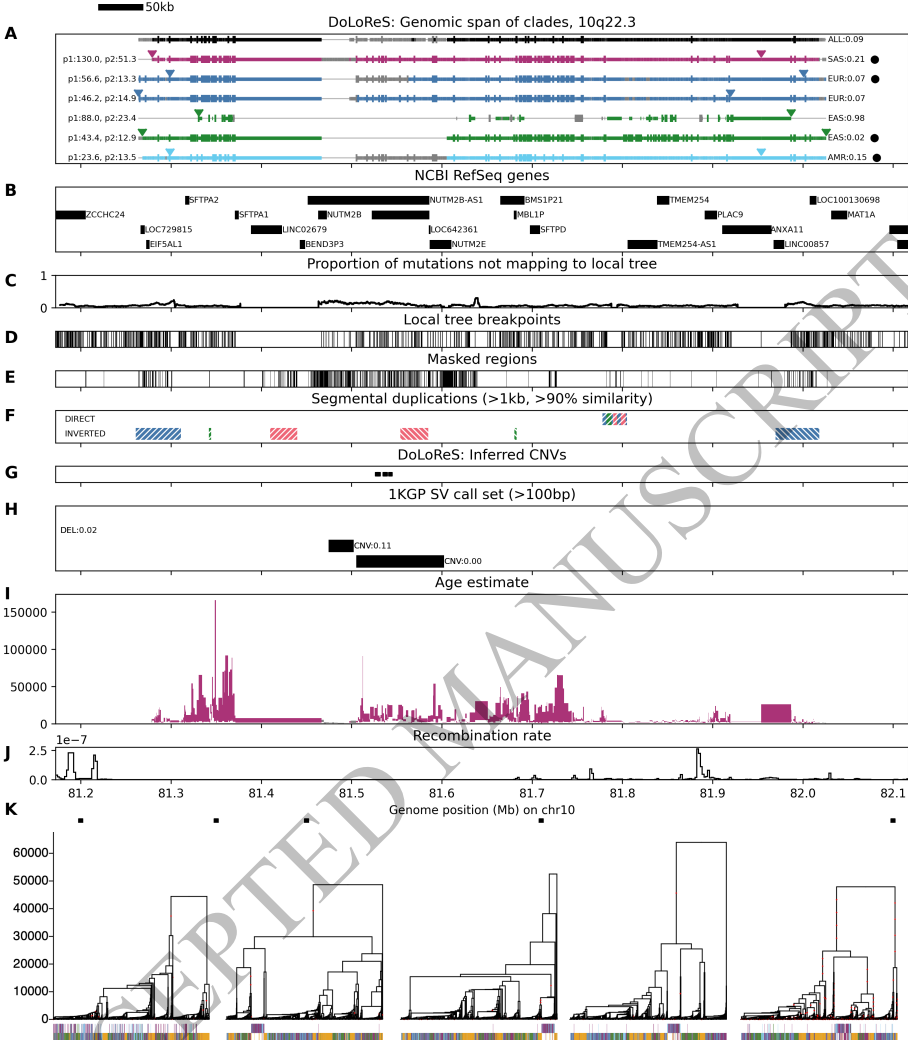 本研究针对基因组结构变异(SV)检测难题,开发了DoLoReS算法,通过分析重构家系(ARG)中单倍型块长度分布异常,成功识别出人类17q21.31倒位等50个重组抑制区域。该研究首次实现从SNP数据推断倒位变异,发现10号染色体760kb新倒位与南亚人群肺功能相关,为结构变异研究提供了全新视角。