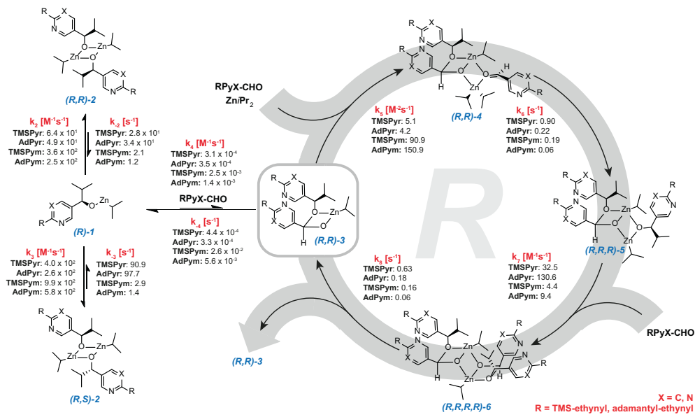 反应网络模拟精确量化了各步骤速率常数:1)锌醇盐二聚体快速平衡(k2/k3);2)锌半缩醛形成是决速步(k4);3)醛与iPr2Zn的配位活化(k7)。